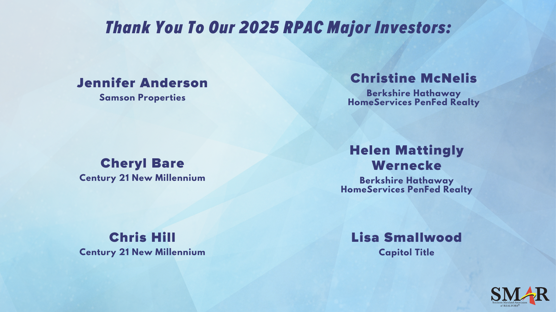 SMAR is guided by a core philosophy that home ownership matters. And we play a key in protecting property rights. Our work also contributes to the economic growth and development that is so vital to the long-term health and vibrancy of Southern Maryland. Diverse economic activity creates jobs and ensures the future of our region. SMAR members are committed to simultaneously supporting economic growth and protecting property rights – balancing the needs of the environment and the integrity of a county’s comprehensive plan. We are actively involved in knocking on and opening doors to legislative bodies, so we can advocate for the issues affecting our members, clients and communities.